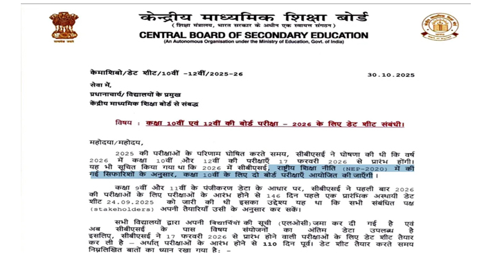 सीबीएसई ने छात्रों से अपील की है कि वे आधिकारिक वेबसाइट से फाइनल डेटशीट डाउनलोड करें और किसी भी अफवाह या अनौपचारिक लिंक से बचें। साथ ही अपने एग्जाम कैलेंडर को अपडेट कर लें, क्योंकि इस वर्ष परीक्षा पैटर्न और शेड्यूल में कुछ महत्वपूर्ण बदलाव किए गए हैं।